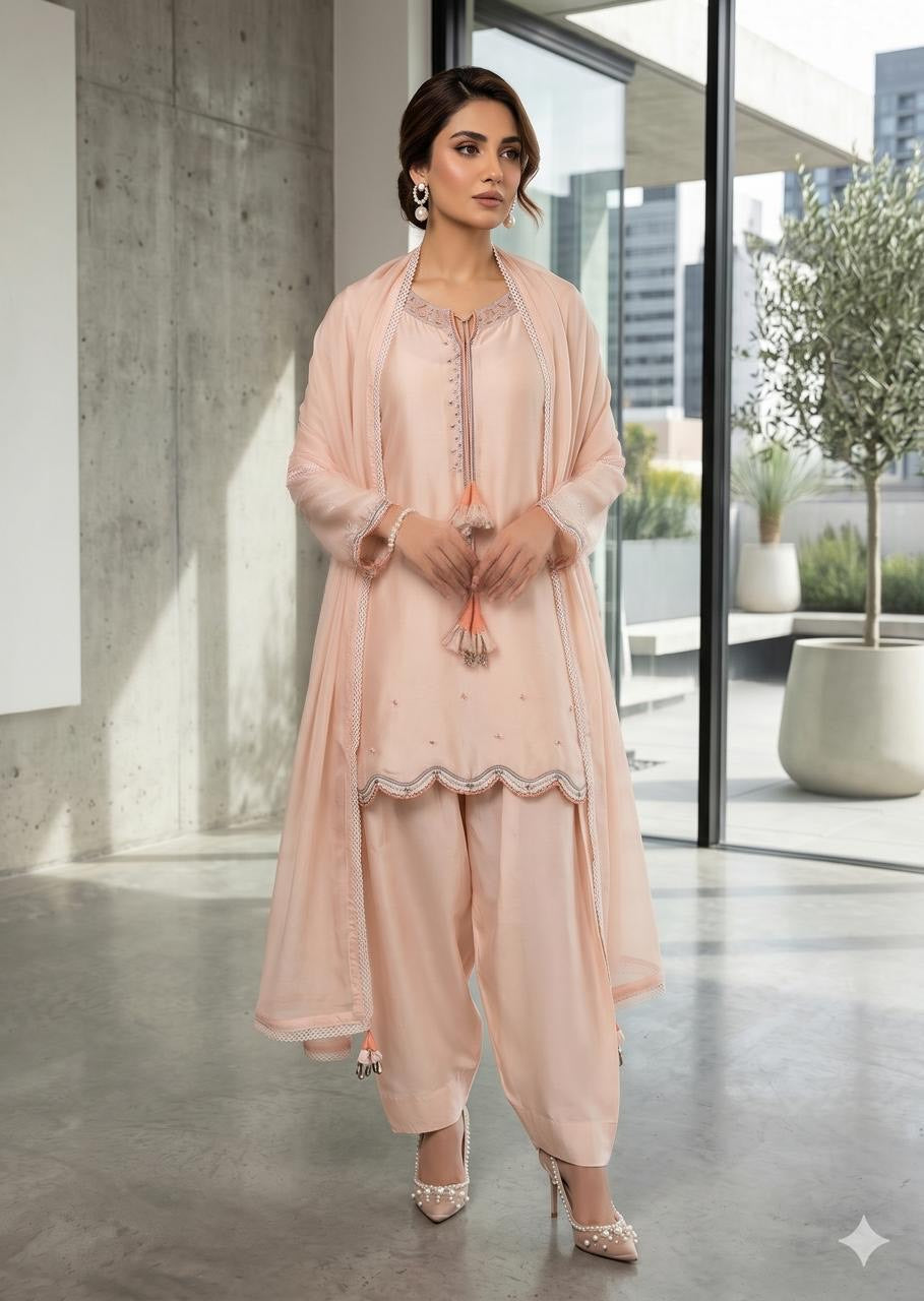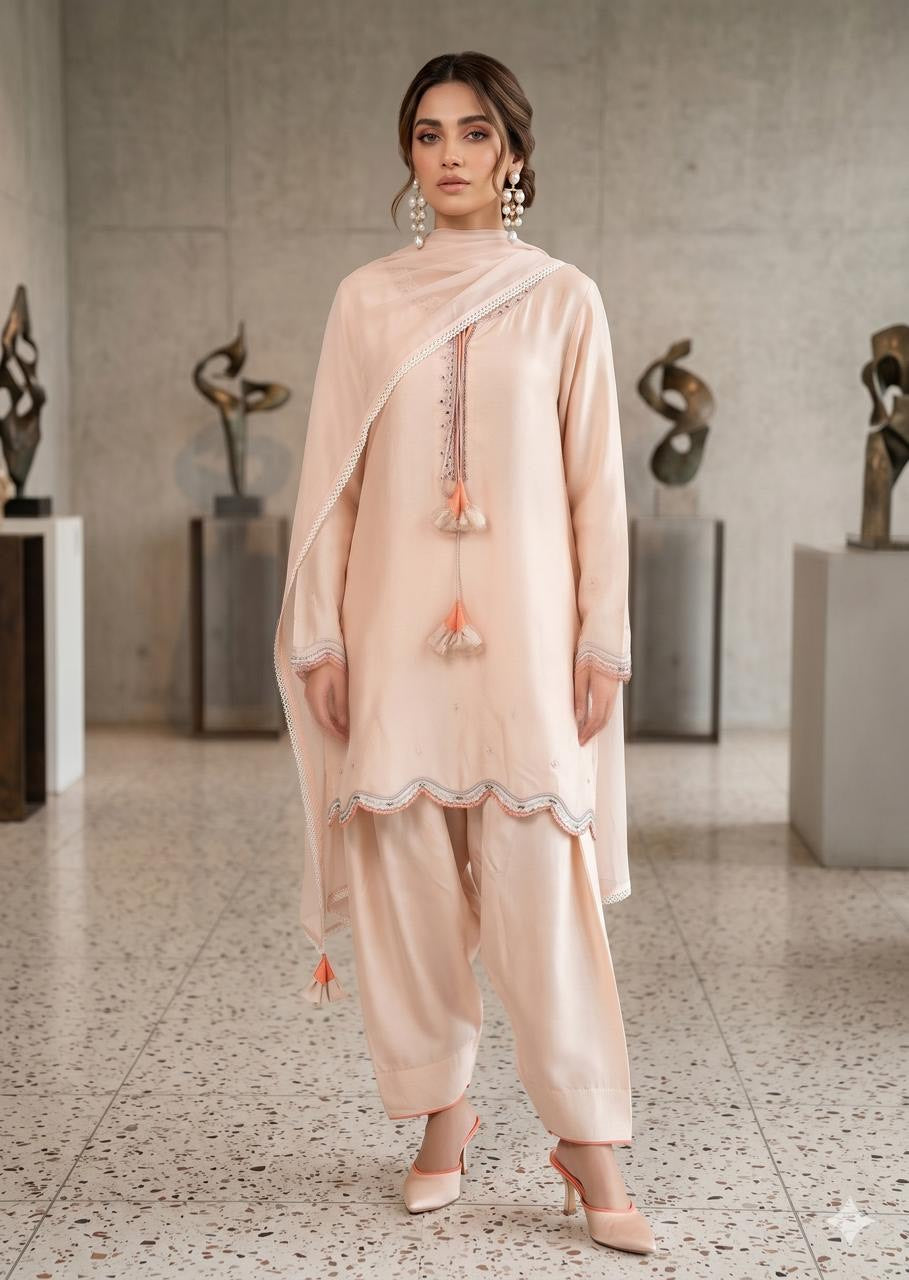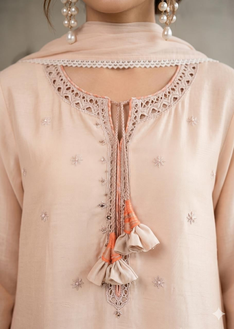 WAJEEHA ANSARI - Beige 3 Piece Silk mirror set